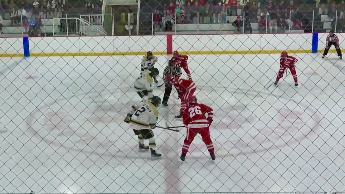 Just a minute into the second the Kelley + Sabataso connection would strike again. Yet another 2-on-1 opportunity would produce a Kelley to Sabataso connection and the latter snapped a quick shot by Bonina for the 3-0 lead. Just a couple minutes after the Colonials’ 3rd goal, the Pioneers would finally get on the board. A shot from the point by sophomore defenseman Erik Nordahl was blocked out in front of Feldman, who was trying to find the puck and tie it up. Pioneers senior Jake Stacy was banging away at the loose puck and he found the back of the net to cut the lead to 3-1. St. John’s would get a power play opportunity with 9:00 left in the period and would add to their score quickly. Off the faceoff junior Tyler Bergman was carrying the puck behind the net, but on the way through, the puck kicked off the side of the net and right onto the stick of junior Brady Chenevert who was at the corner of the post. Chenevert quickly slid it under Feldman’s pad to cut the score to 3-2. After that, both teams traded some chances, and it appeared the period would end 3-2, but junior Ashton Smith had other ideas. With five seconds left in the period, senior captain Daniel Menyalkin chipped a puck off the side wall up to senior captain Anthony Desimone. Desimone quickly went D-to-D to his partner Smith who fired a shot that beat Feldman with one second left on the clock. St John’s never quit on the play and was rewarded with the tying goal at the buzzer.