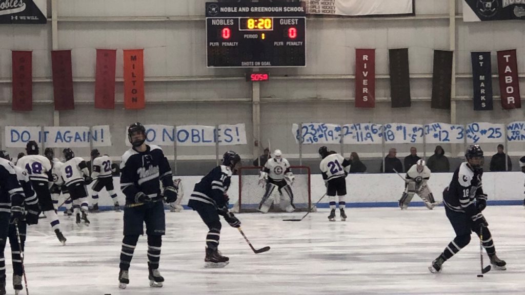 Cushing Academy travelled to Nobles in the other semi-final matchup of the Large School tournament. The winner would move on to St. Anselm’s and play Kent, who beat Deerfield earlier in the day. The rink was filled to capacity and each team had strong support from student sections. The atmosphere was electric from puck drop.